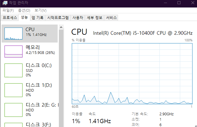 성능 탭을 눌러 CPU 이용률을 확인하고 CPU이용률이 50% 이상으로 굉장히 높은 상태라면 다시 작업관리자에서 프로세스 탭을 누릅니다.