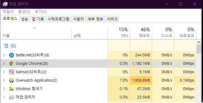 프로세스 탭에서 현재 실행 중인 게임 이름을 찾아서 해당 프로세스의 CPU 사용률을 확인합니다. 필자의 게임은 cpu사용률이 7% 밖에 되지 않아 상당히 안정적입니다. 이 정도의 사용률이라면 그래픽카드 성능 저하가 일어날 수 없는 환경입니다.