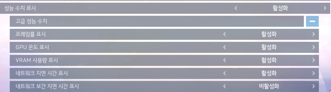 그래픽 성능 수치를 게임 화면상에 표시하려면 설정에서 활성화를 해준 후에 GPU 온도 표시도 활성화해줍니다. 네트워크 지연시간 표시도 활성화해주세요. 네트워크 지연시간은 작을수록 응답속도가 빠른 것을 의미합니다.