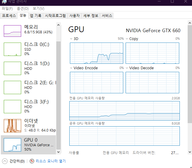 GPU 사용률도 확인하여 3D 항목을 확인합니다. 필자의 지포스 그래픽카드는 GTX660이라는 아주 오래된 그래픽카드임에도 불구하고 현재 GPU사용률이 50% 미만이고 온도가 66도 임으로 오버워치 게임을 원활하게 할 수 있는 수준입니다. 그래픽 카드는 지포스와 라데온 그래픽카드가 양대 산맥을 이루고 있습니다.