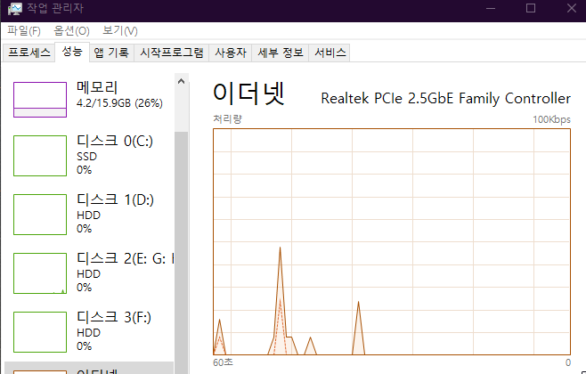 사용자는 화면이 끊기는 것처럼 느껴지는 것을 그래픽카드 성능저하로 생각할 수 있으나 혹시라도 내 인터넷 환경이 문제가 있는지 확인해 봅니다. 최고값이 100 kbps라고 적혀있는 화면에 그래프가 절반도 올라가지 않는 환경이라면 50 kbps를 사용 중이라는 의미이며, 보통 가정집 인터넷 환경의 속도가 1 Gbps 이상임으로 1Gbps = 1000 Mbps이고, 1000 Mbps=1000000 kbps입니다. 그렇다면 50/100000050*100=0.005%로 계산하여 총 네트워크 대역폭 중에 0.005%만을 사용 중인 것으로 아주 원활한 인터넷 상태입니다.
