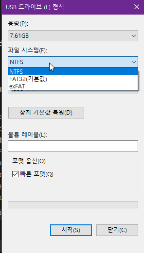 포맷 옵션을 빠른 포맷으로 선택한 후 시작 버튼을 눌러줍니다. 이 옵션을 빠른 포맷으로 하지 않는 것은 손해입니다. 속도만 느릴 뿐 결과의 차이가 거의 없기 때문입니다.