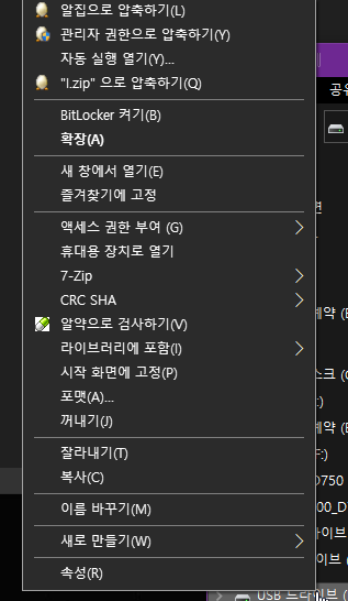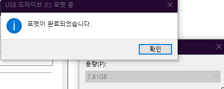 빠른 포맷이라 몇초후에 포맷이 완료되었다는 창이 뜨고 나서 파일 탐색기에서 USB 메모리를 마우스 우클릭하여 속성 창으로 들어가 줍니다.