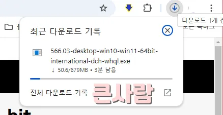 제가 쓰는 크롬 다운로드 기록을 볼 수 있습니다. 566.03-desktop-win10-win11-64bit-international-dch-whql.exe가 다운로드 중인 것을 알 수 있습니다.