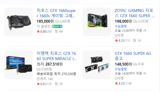 또한 RTX 3050의 성능과 GTX 1660 Super의 성능이 별반 차이가 나지 않는 것을 볼 수 있습니다. 만약 오래된 그래픽카드를 사용하고 있다면 GTX 1660super의 중고가는 10만원 선이기 때문에 특별히 고사양 게임을 하지 않는다면 좋은 그래픽카드 업그레이드 방법입니다.