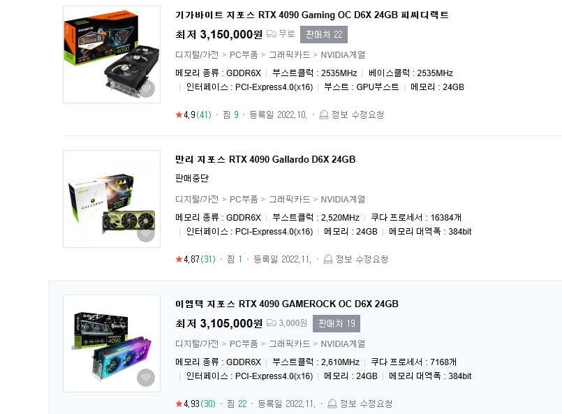 RTX4090의 현재 새제품 가격은 300만원 선으로 형성되어 있습니다. 하이엔트 그래픽카드에 걸맞게 한달치 월급에 맞먹는 가격이네요.